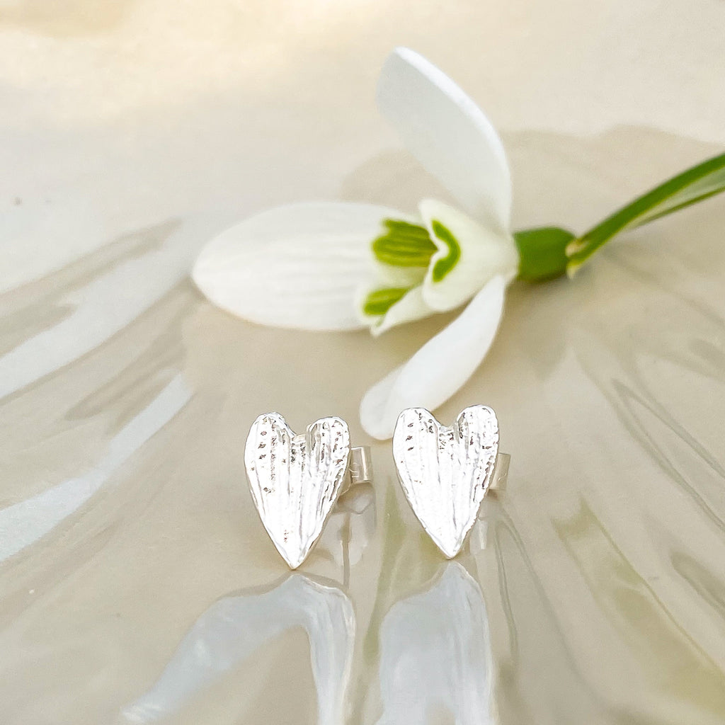 These exquisitely detailed and textured heart earrings, have been created from an actual snowdrop we collected from a beautiful woodland glen nearby our studios here in the Isle of Man. The inner petals of the snowdrop are heart shaped, and wonderfully detailed. Using the method of lost wax casting to preserve the incredible detail of the petal, enabled me to create the 'love heart' snowdrop petal stud earrings... a wonderful token of love inspired by mother nature.