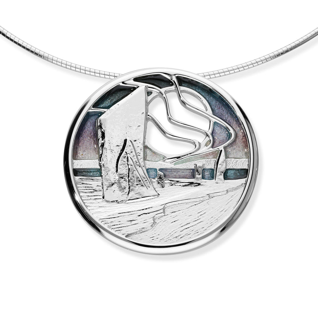 Inspired from the many images of the Northern Lights which are often seen in Orkney, this sterling silver pendant features the standing stones with a sky hand enamelled with the colours of the Northern Lights.